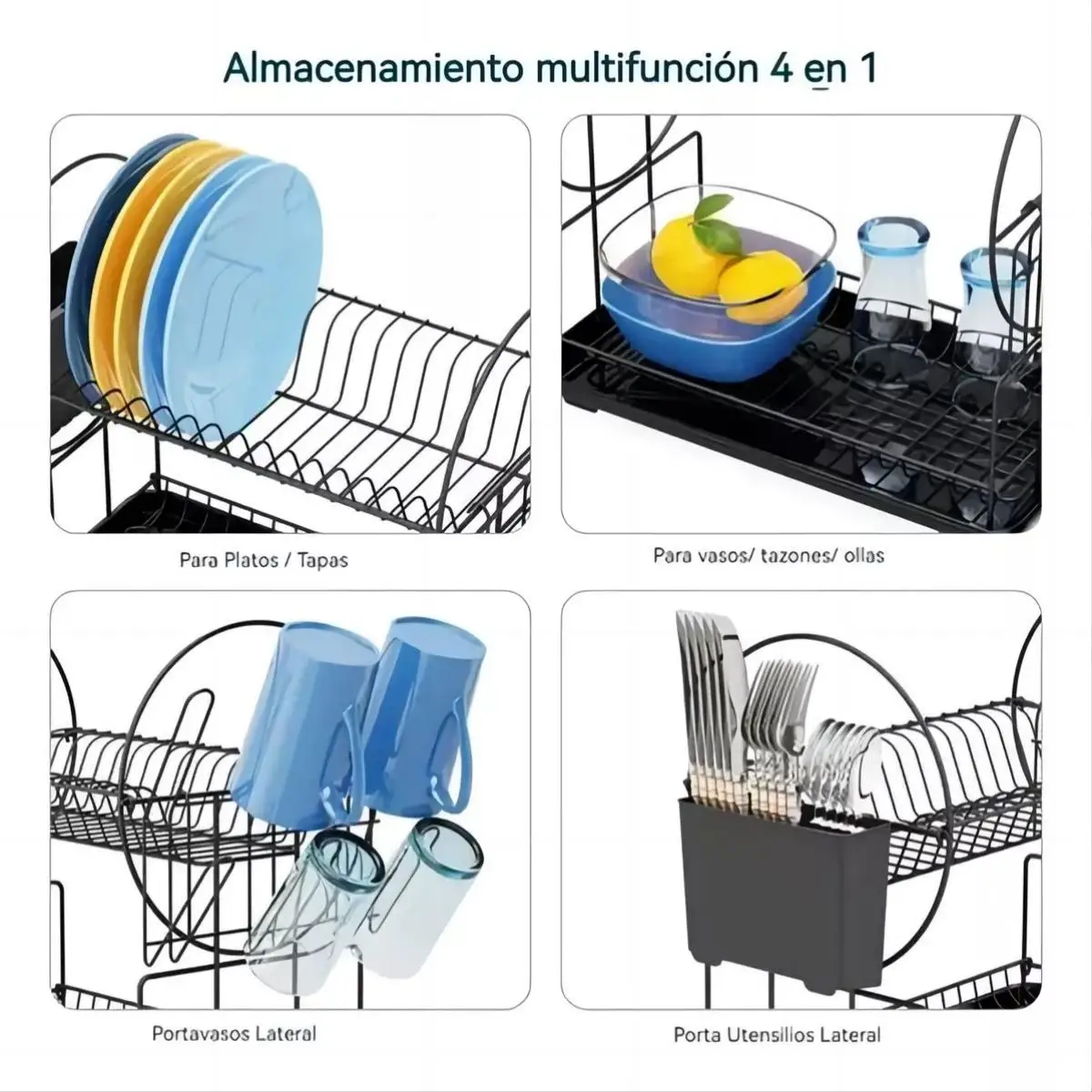 Este escurreplatos cocina utiliza una estructura de dos niveles que optimiza el espacio vertical de la cocina. Esto permite una distribución más ordenada de los utensilios de cocina, ocupando menos espacio en la encimera pero brindando una mayor capacidad de almacenamiento.