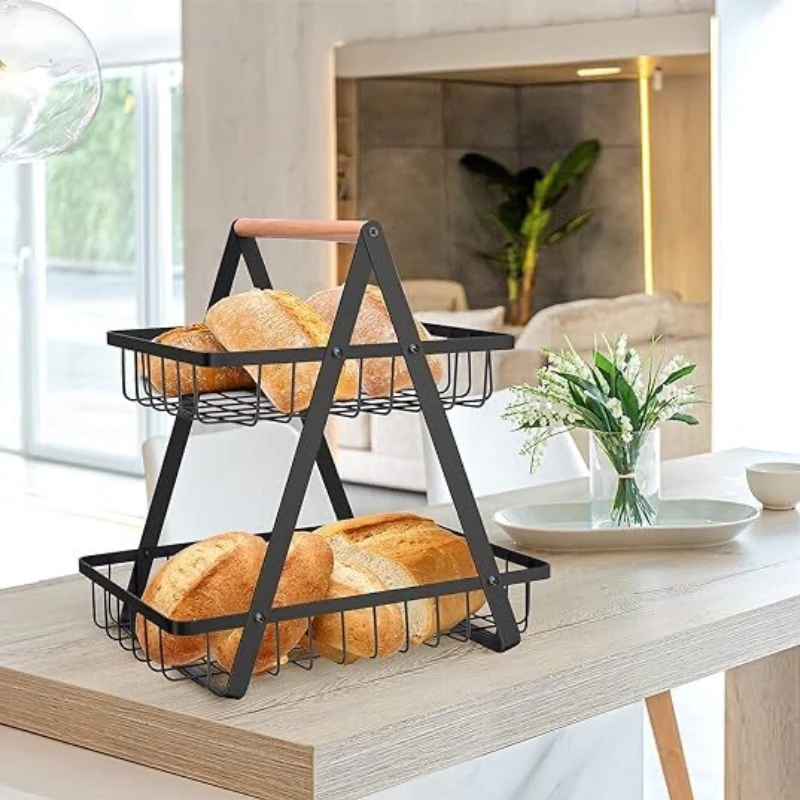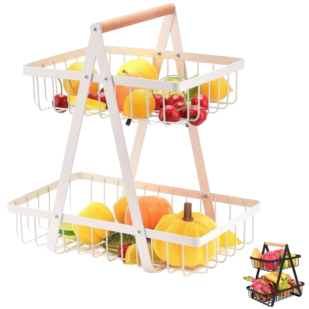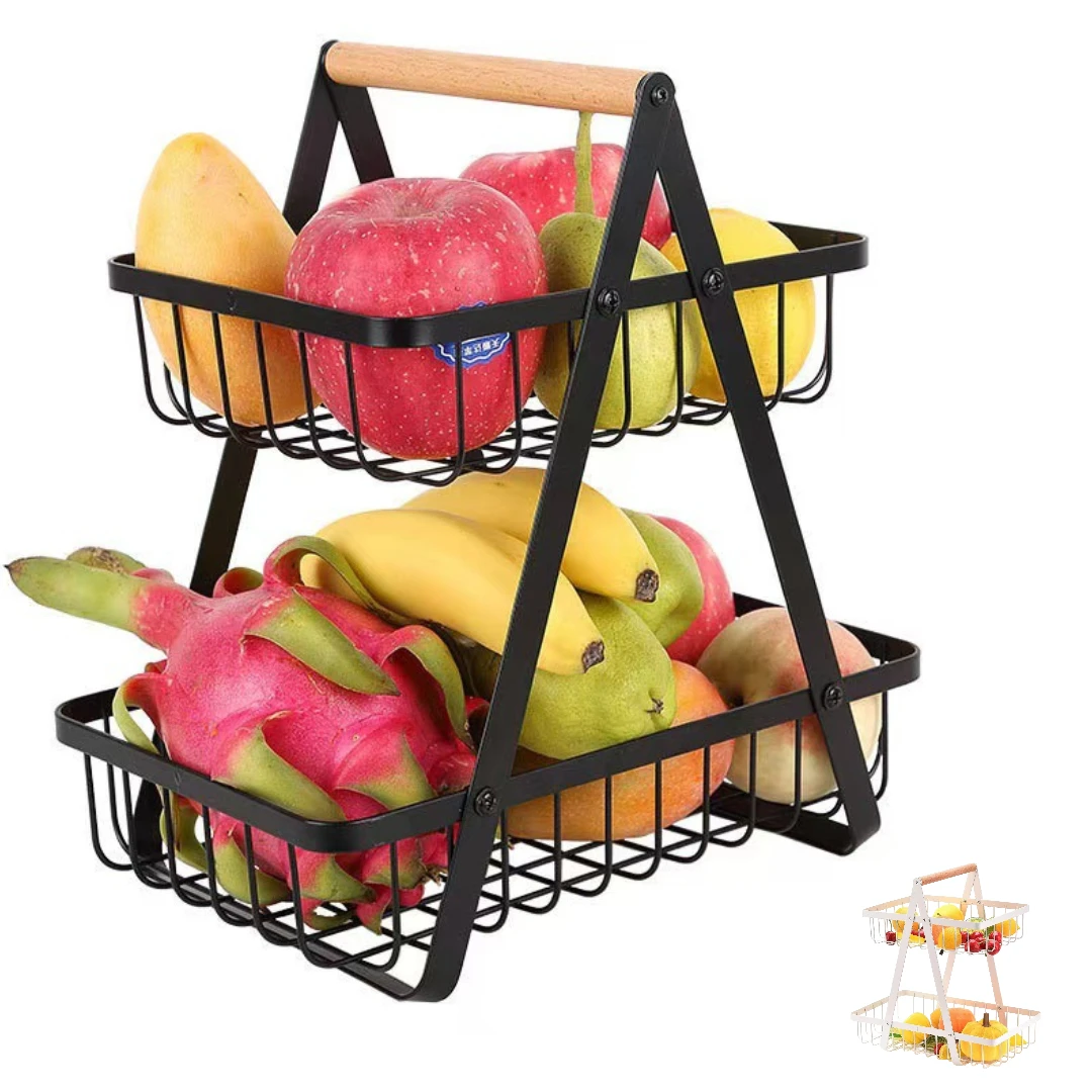 Frutero Organizador de Cocina 2 Niveles para Almacenamiento Multiusos de Metal con Mango de Madera