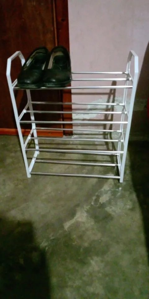 Llegó antes de lo previsto, es bastante ligero y la base está hecha de plástico con barrotes de aluminio. Lo unico malo que encontré es que llegó con una barra daña, está algo chueca de la base y es más pequeño de lo que imagine. Aún asi, la parte de arriba me sirve para mis botines y en los demás espacios puedo poner mis zapatos, tenis y sandalias.